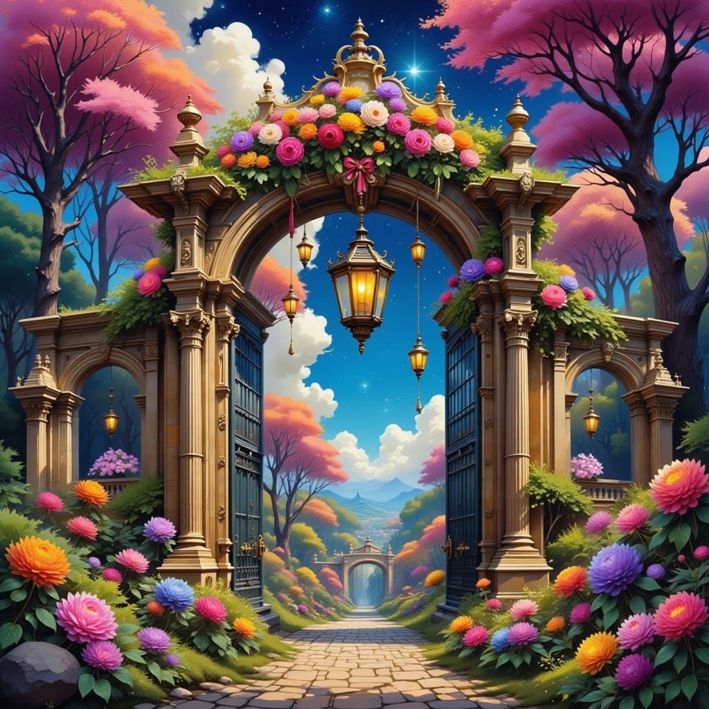 This image depicts a grand, ornate gateway to Spring May Day festivities, surrounded by swirling astral clouds and stardust, adorned with vibrant flowers and delicate ribbon pendants in a rich, cosmic 8k holographic illustration.