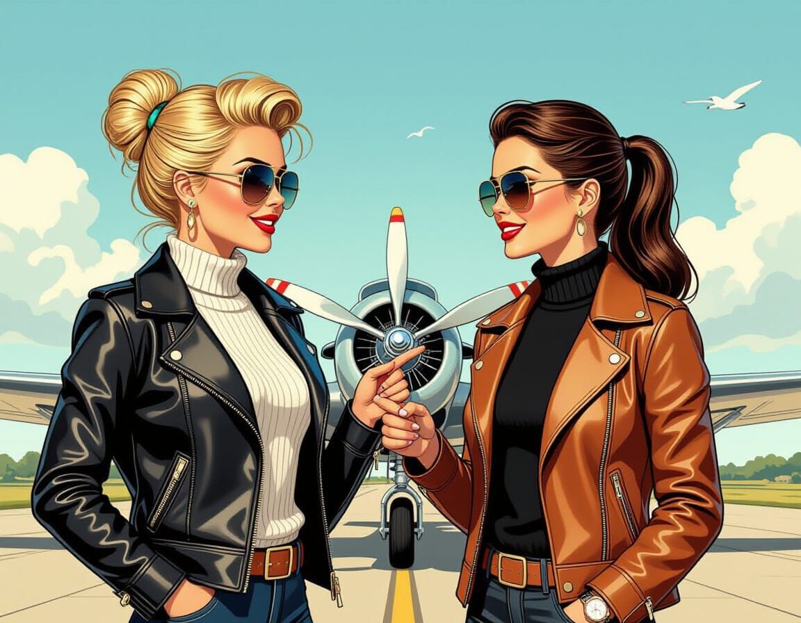 A color comic art style image of two stunning female pilots in vintage attire. They stand before a classic propeller plane, gesturing towards the horizon in this nostalgic, hand-drawn scene.