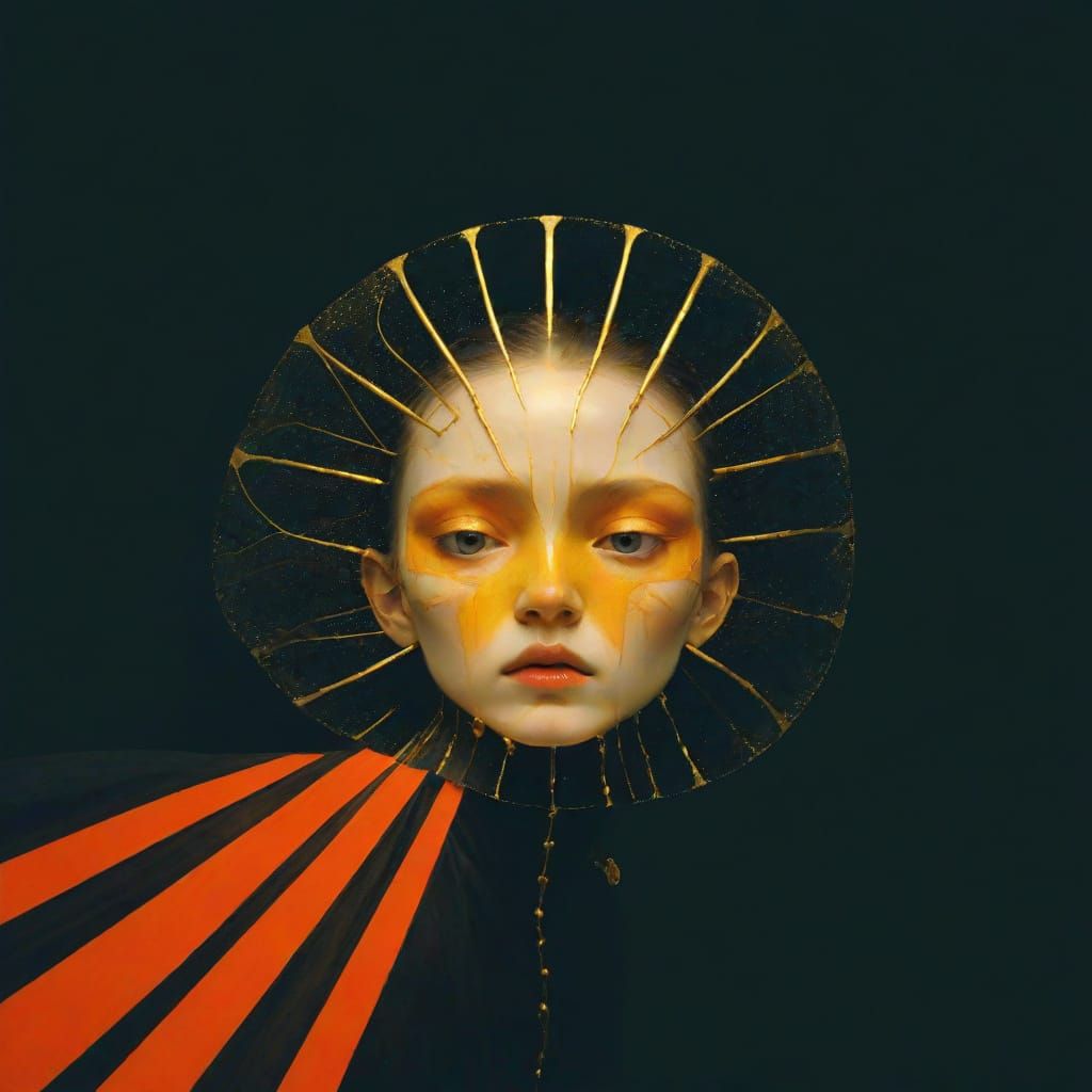 This image depicts a majestic woman in a lavish, golden setting, echoing the intricate styles of Art Nouveau masters.
