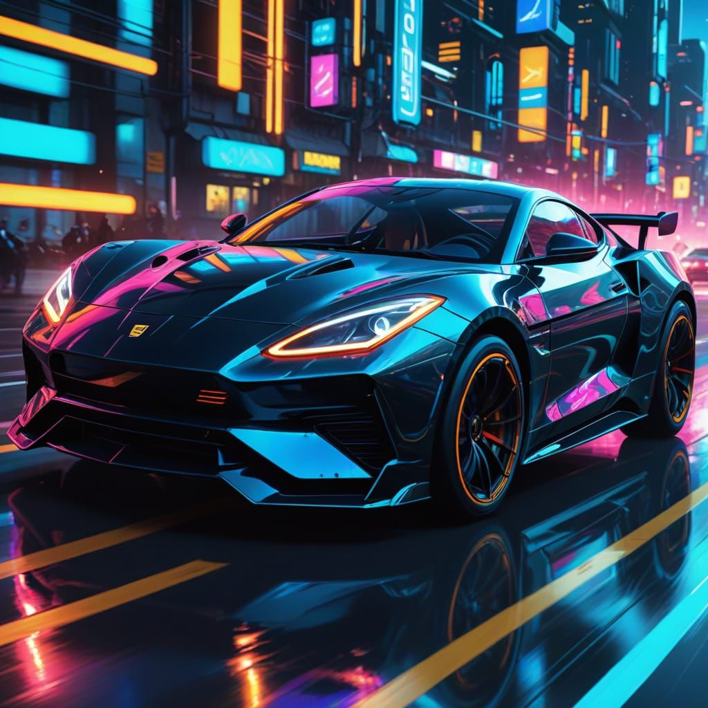 A close-up image of an Afrofuturistic sports car speeding along. The digital painting uses vibrant triadic colors and dynamic lighting with glowing blue accents, in a neon-lit, sleek style.