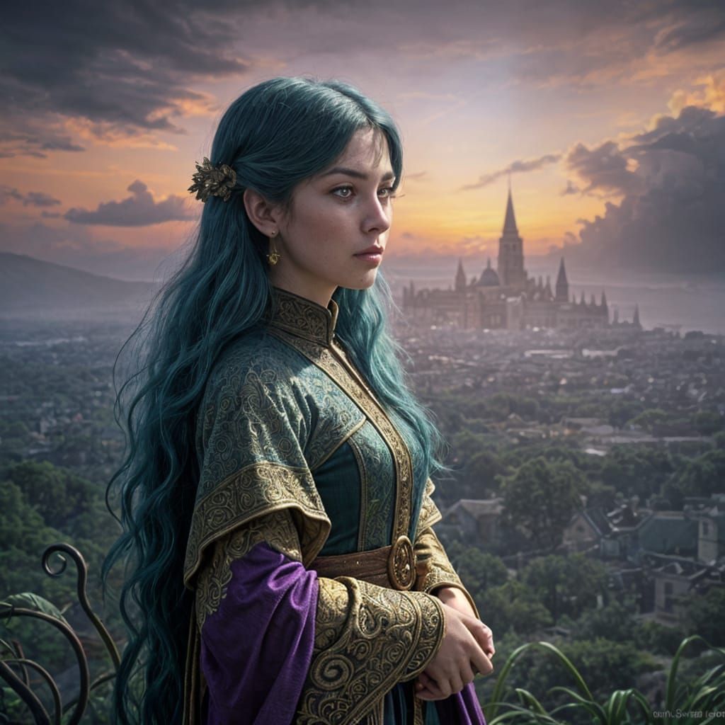 A surreal landscape with a twilight sky in harvest gold and purple. The scene features Art Nouveau kaleidoscopic patterns, green foliage, and pointillist water droplets in blue, capturing a mystical Renaissance ambiance as mosaic art.
