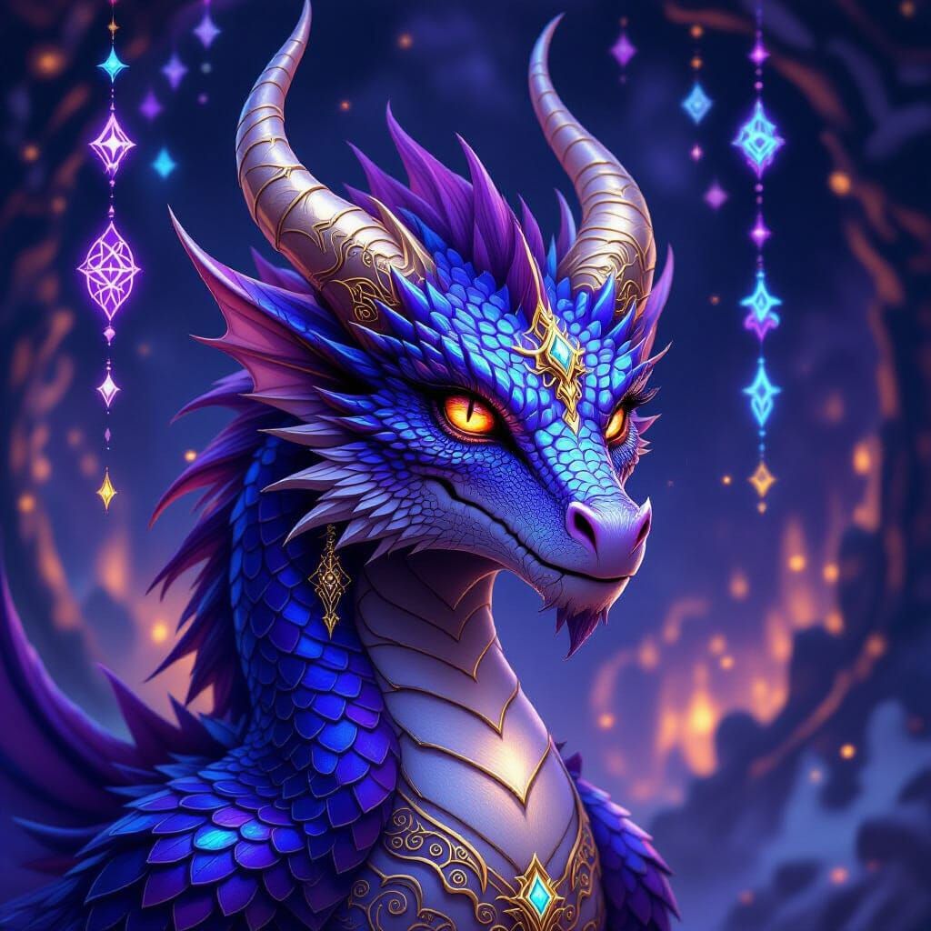A majestic dragon shimmers with iridescent purple and blue scales, its eyes radiating magic. Golden markings adorn its face and neck, surrounded by floating runes in this ethereal fantasy portrait.