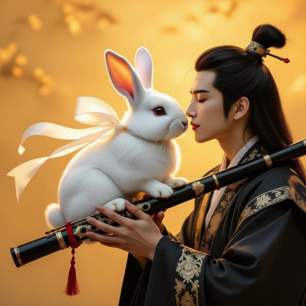 This image shows a white rabbit with a ribbon riding a black flute decorated with red. In the background, two figures share a kiss, all rendered with dramatic lighting and textures in a hyperrealistic style.