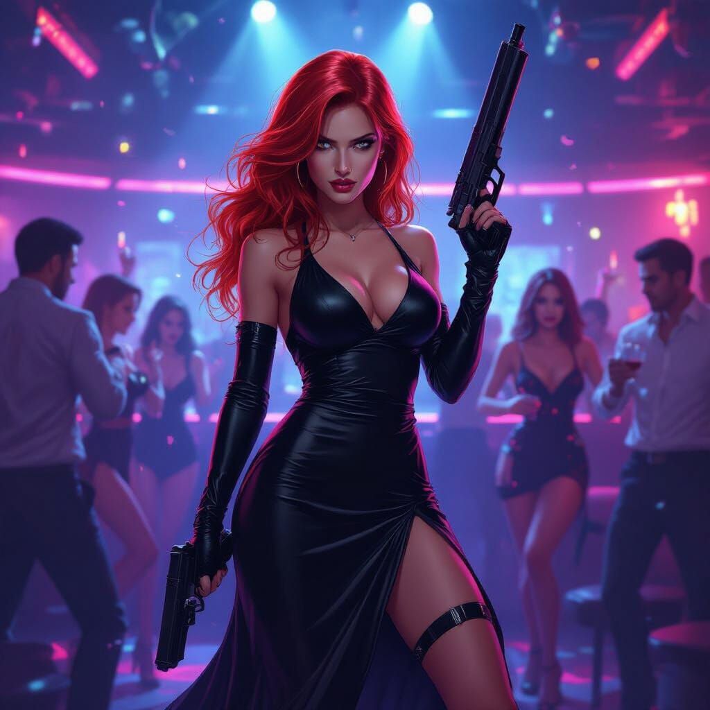 A digital artwork of a red-haired agent in a black dress holding a weapon in a nightclub, surrounded by dancers. The piece is cinematic, neon-lit and futuristic.