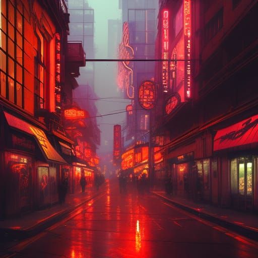 A vibrant street scene bathed in neon light. This picture shows a digitally painted red-light district with dynamic lighting and volumetric effects in orange and teal tones.