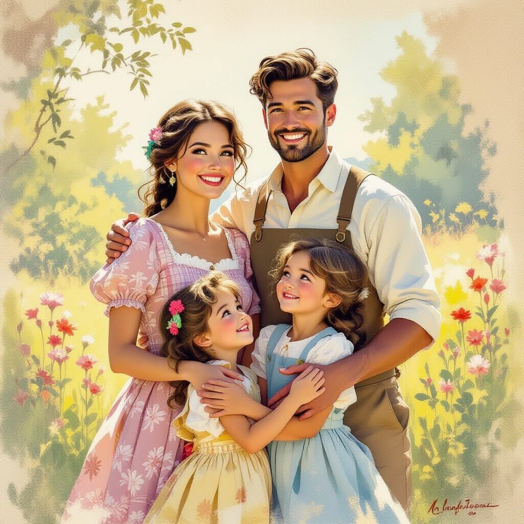 This image shows a family of four embracing in a sunny, warm environment. The mother wears a long dress, the father a white shirt, and the two daughters colorful clothes, all rendered with soft brushstrokes and pastel colors in a whimsical style.