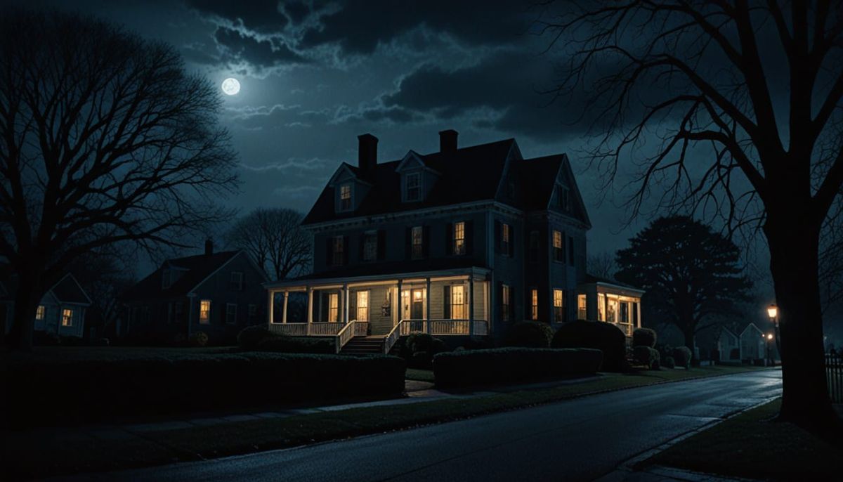 A cinematic image of the Amityville house at night, shrouded in shadows. The ominous atmosphere is enhanced by moonlight, creating an eerie and spooky scene reminiscent of an oil painting.