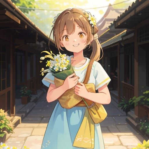This image shows a young woman standing in a bustling Thai city center, surrounded by vibrant colors and lush greenery. The scene is rendered in a soft, oil painting style with intricate details and rich textures.