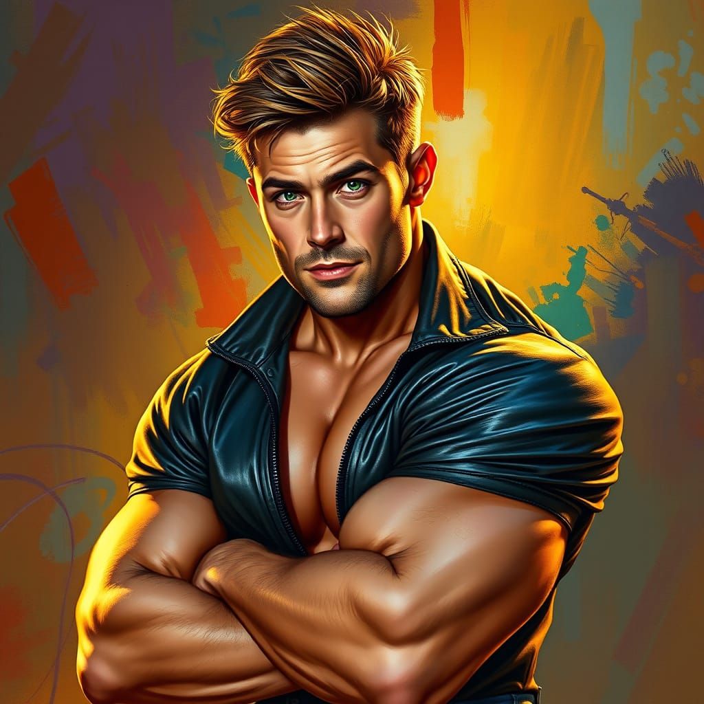 This image shows a hyperrealistic portrait of a rugged man with striking green eyes. The artwork features dynamic abstract shapes in a vibrant color palette, with a dramatic side light enhancing his muscular physique.