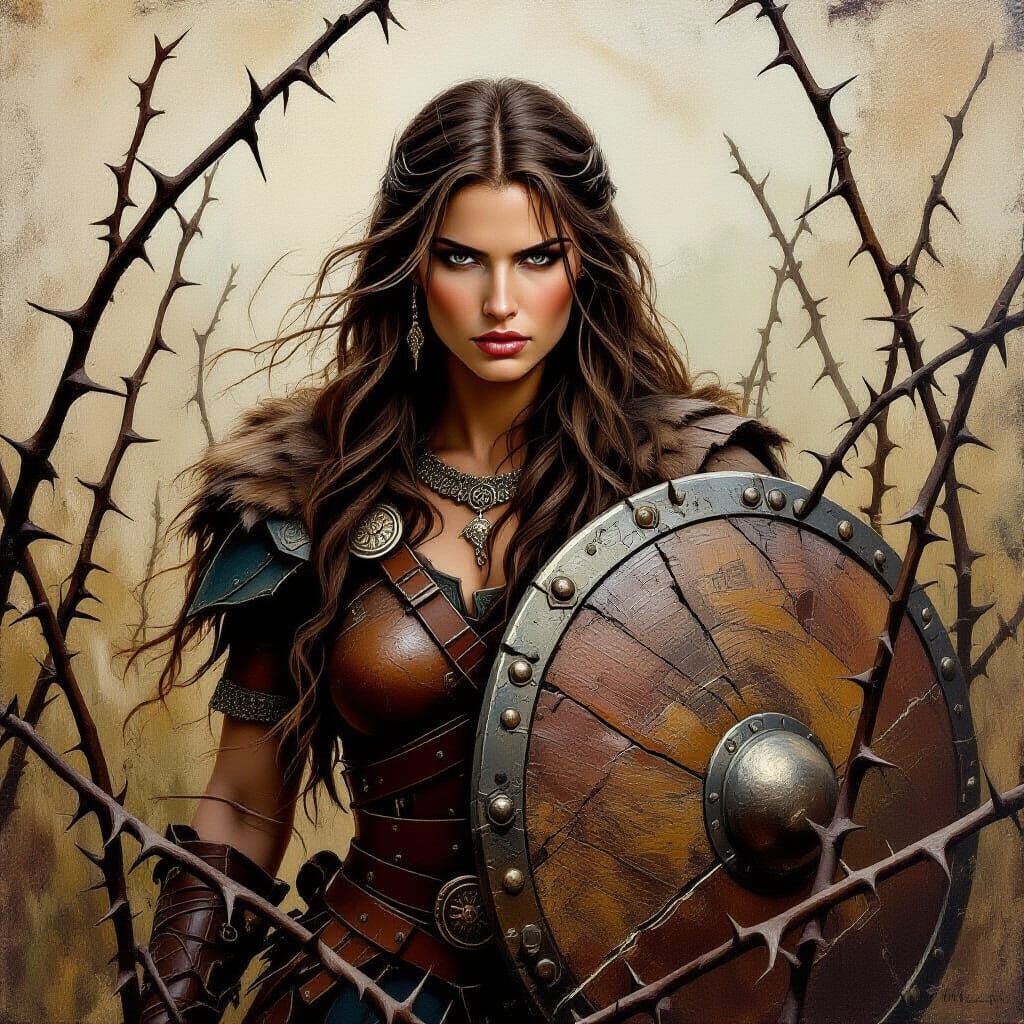 A striking picture of a Norse goddess pushing through a thicket. The painting features visible brushstrokes and a misty palette of browns, creams, and greens. The goddess's stern expression evokes quiet foreboding in this heavily textured encaustic impasto painting.