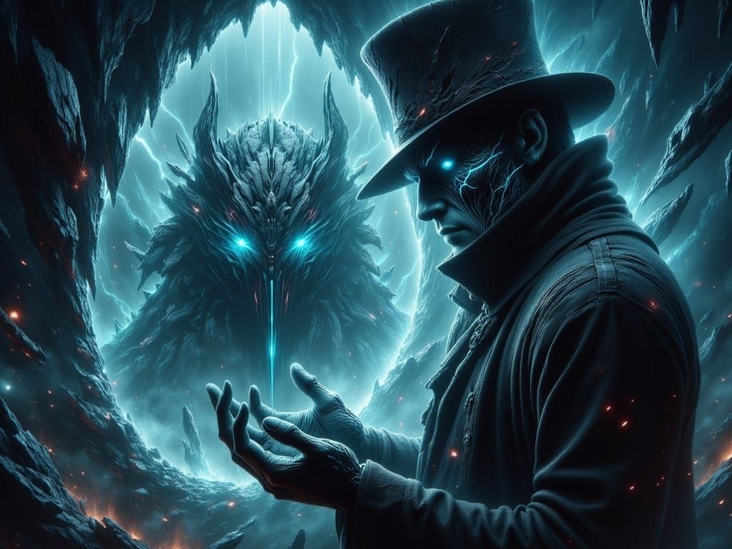 This image depicts a mystical, dark magician standing at the edge of a distorted portal, summoning eldritch creatures from beyond reality. The air is thick with an eerie, pulsating mist and impossible geometry, set against a muted, eerie color palette with flashes of neon green and red.