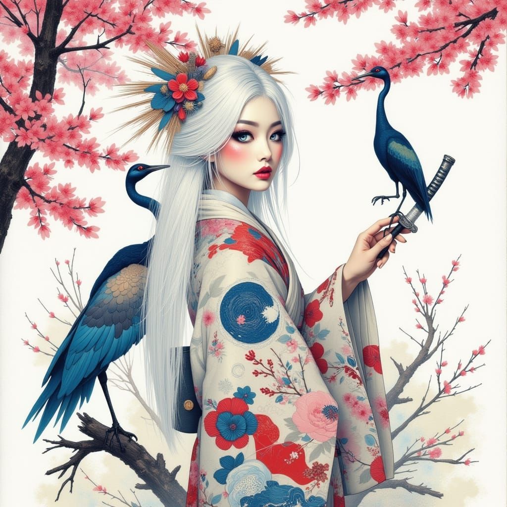This image shows a geisha cat lady with blue eyes in traditional attire, holding a samurai sword. Cherry blossoms, blue cranes, and flowing white hair add to the serene, dreamy landscape in a Japanese art style.