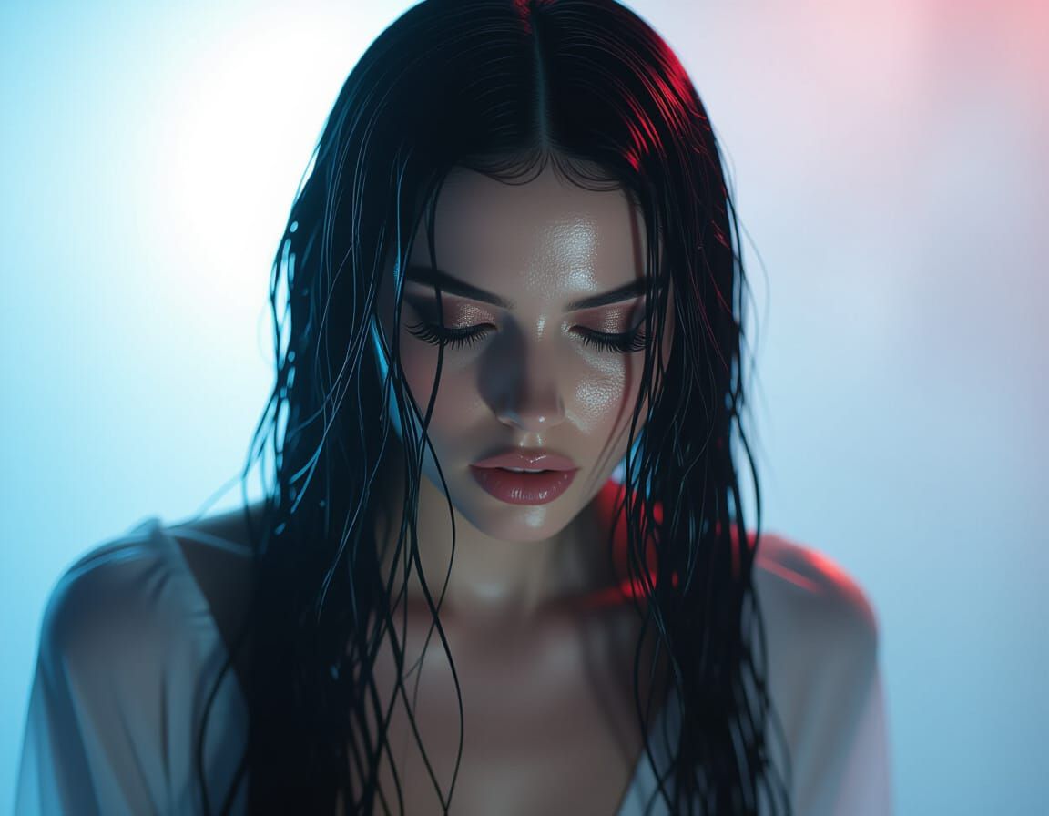 A photorealistic, ultra-detailed image of a luxury fashion model with wet, ultramarine hair, depicted in a melancholic, ghostly state. Ethereal hues of vermilion and carmine blend with cinematic lighting.
