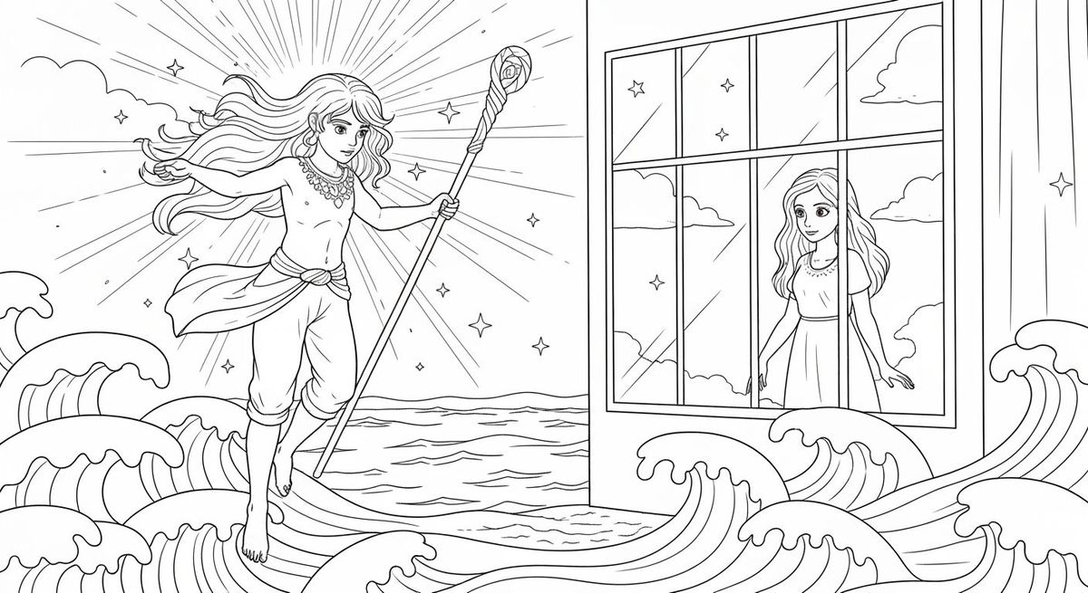 This line drawing features a radiant celestial boy with golden hair descending, holding a staff. A young woman watches from behind a window near a sea with waves and stars, in a bold outline style.