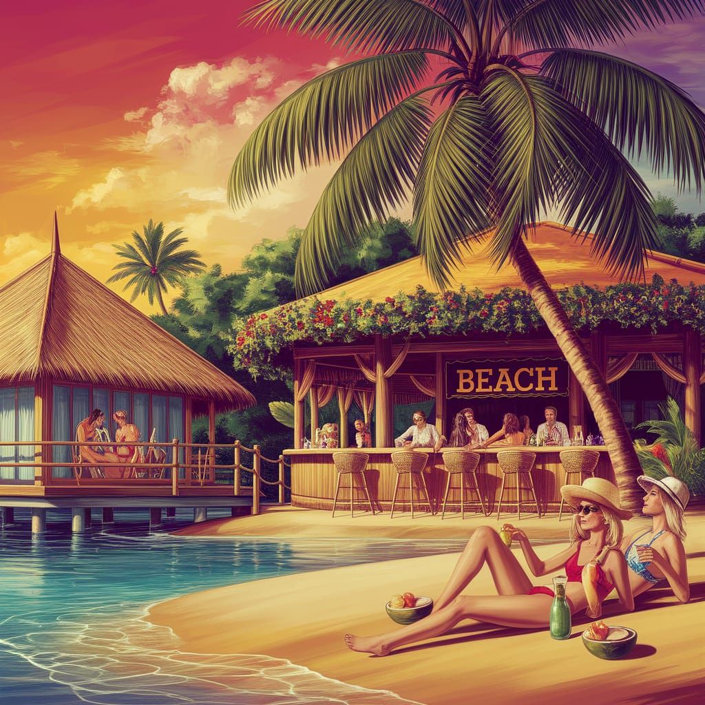 A vibrant image of Mauritius beach life on a sunny summer day. The scene features a luxurious water bungalow, a palm tree, and women relaxing on the golden sand. A lively beach bar is visible in the background.