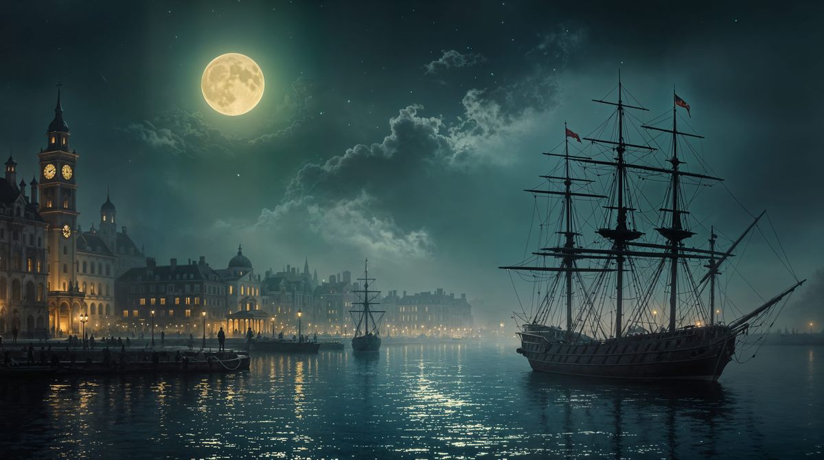 This image captures a serene, misty harbor city at night, blending realism and impressionism. Tall ships and illuminated buildings reflect off the calm, teal-hued water, under the soft glow of a large moon.