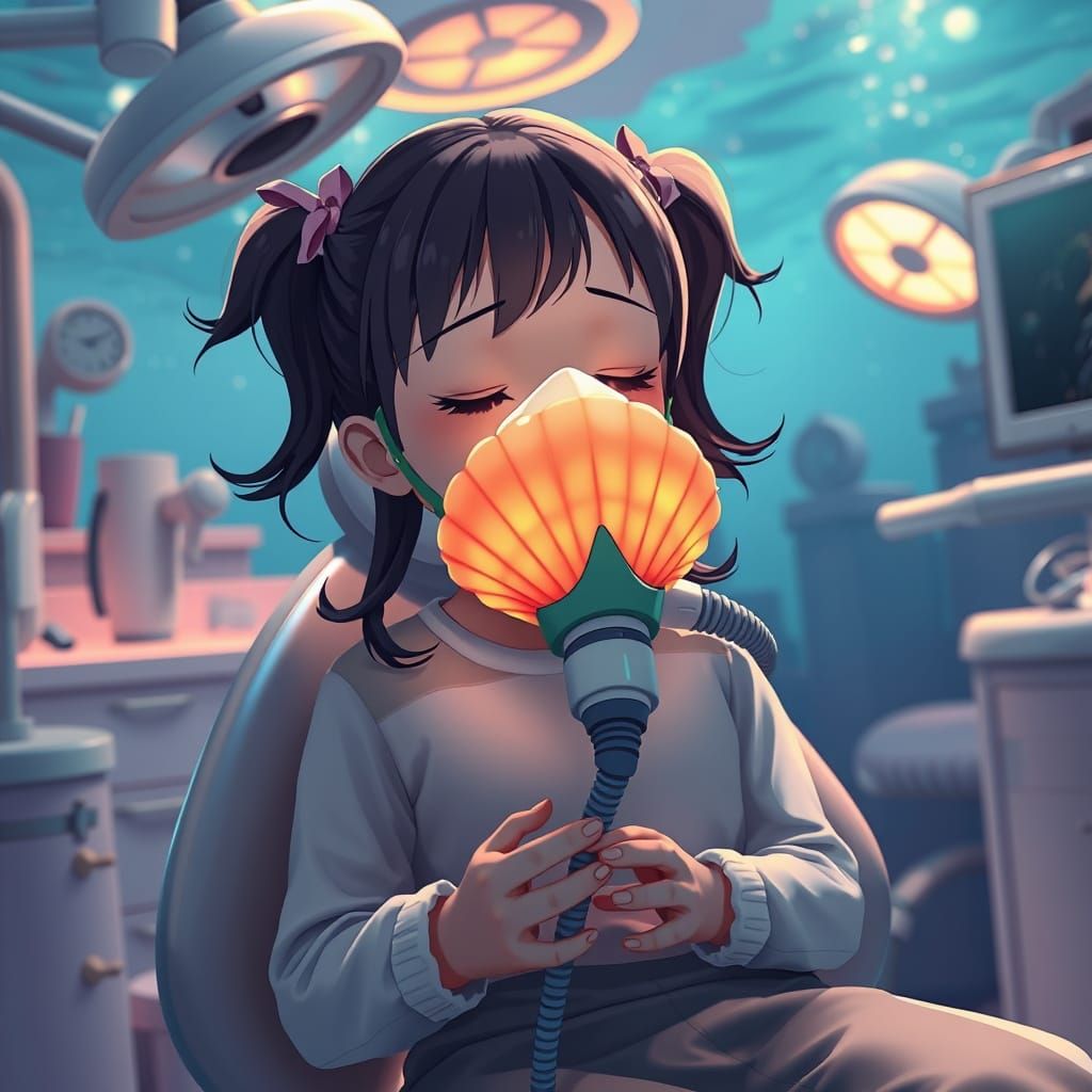 This image shows a girl in a dental chair wearing a seashell mask and squeezing a rebreather bag. The hyperrealistic anime scene features an underwater dental room with detailed textures, refined lighting, in a detailed digital art style.
