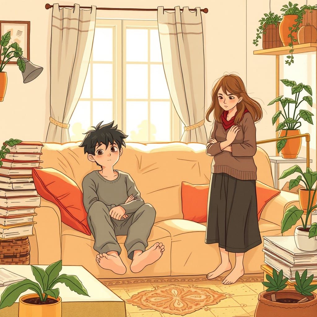 A heartwarming illustration of a teenager lost in thought, surrounded by a cozy living room's soft lighting, plush furniture, and vibrant details, evoking a peaceful and contemplative atmosphere