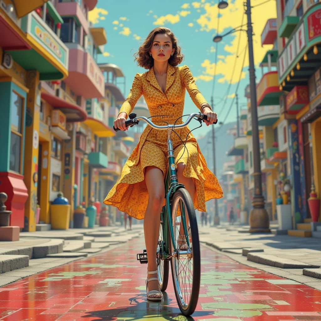 This image shows a youthful and innocent pinup girl from the 1950s riding a bicycle down a vibrant, pop-art-inspired street.