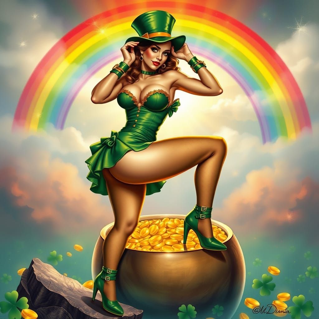 This vibrant pinup girl exudes confidence and charm, posing seductively on a pot of gold at the end of a rainbow, with bold, dynamic colors and a classic pinup aesthetic reminiscent of pulp comic art