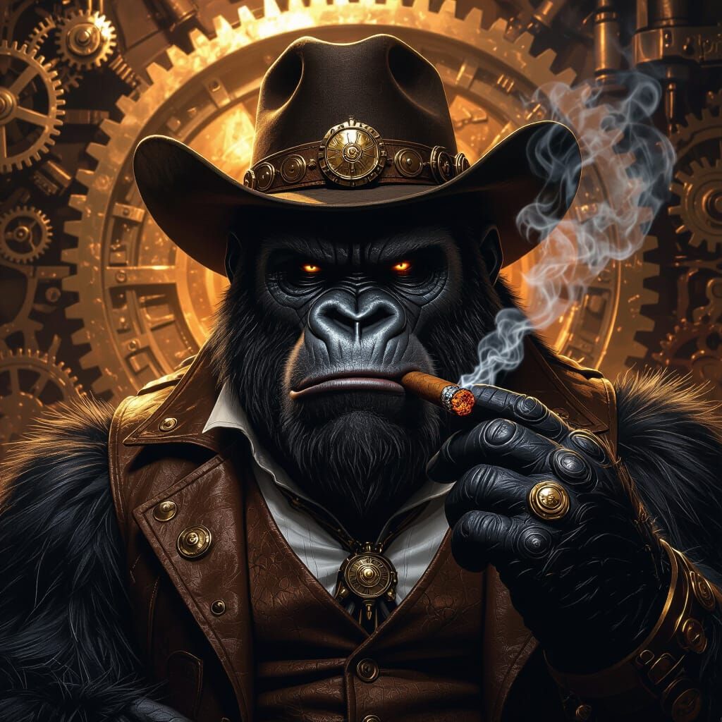 This hyperrealistic digital painting depicts a muscular gorilla in steampunk cowboy attire, holding a smoking cigar. Intricate gears and a fantastical engine form the backdrop, illuminated by dramatic chiaroscuro lighting.