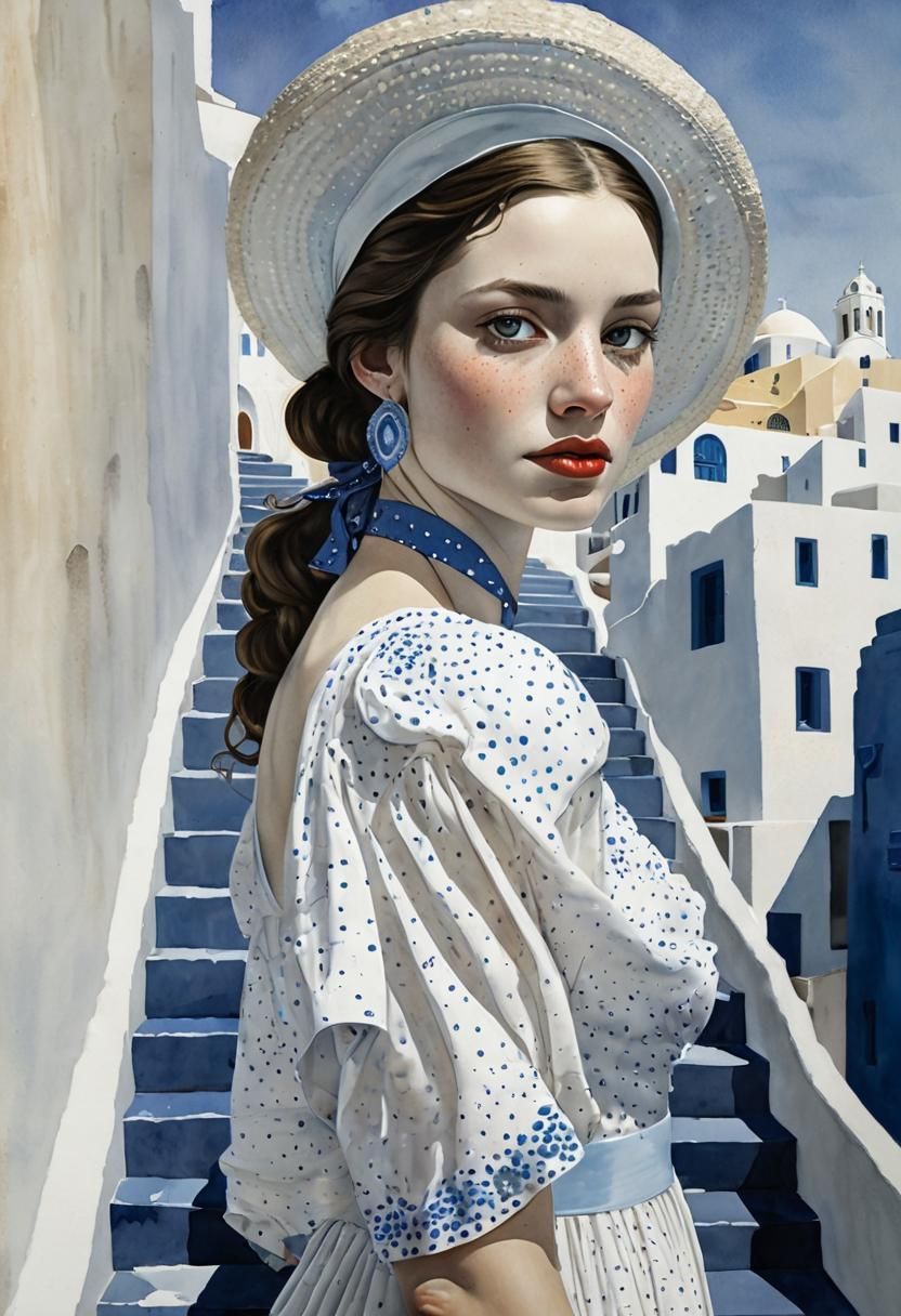 This image shows a beautiful dark-haired woman in a flowing white dress walking down whitewashed stairs in Santorini. The scenery captures the charm of the Mediterranean in watercolor art style.