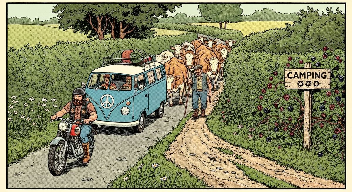 This image shows a vintage comic book illustration of a British country lane. A blue VW camper van and a biker are stuck behind a herd of cows being led by a farmer in muted, earthy tones.