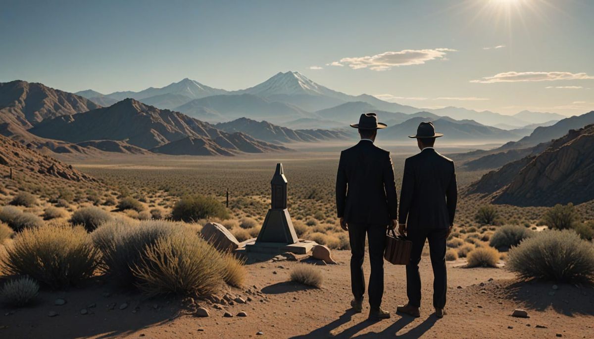 This image shows Men in Black agents at the Pacific Crest Trail's southern end, near the border monument. They are in black suits and sunglasses, with subtle sci-fi tech suggesting a hidden purpose in a realistic, cinematic style.