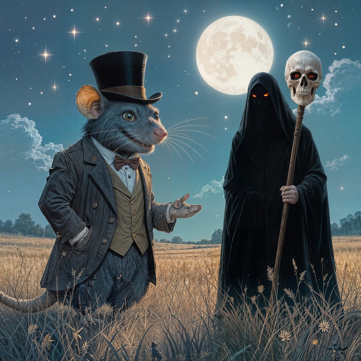 This image shows a large, menacing rat dressed in a tattered suit and top hat, conversing with a shadowy, hooded figure under a moonlit sky in a magical prairie. The artwork has a dark fantasy aesthetic.