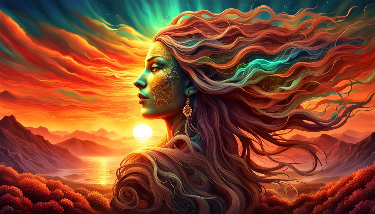 A beautiful digital artwork of Mother Earth with flowing hair set against a vibrant sunset. The image blends nature scenes and abstract designs with rich colors to evoke dreams and resilience.