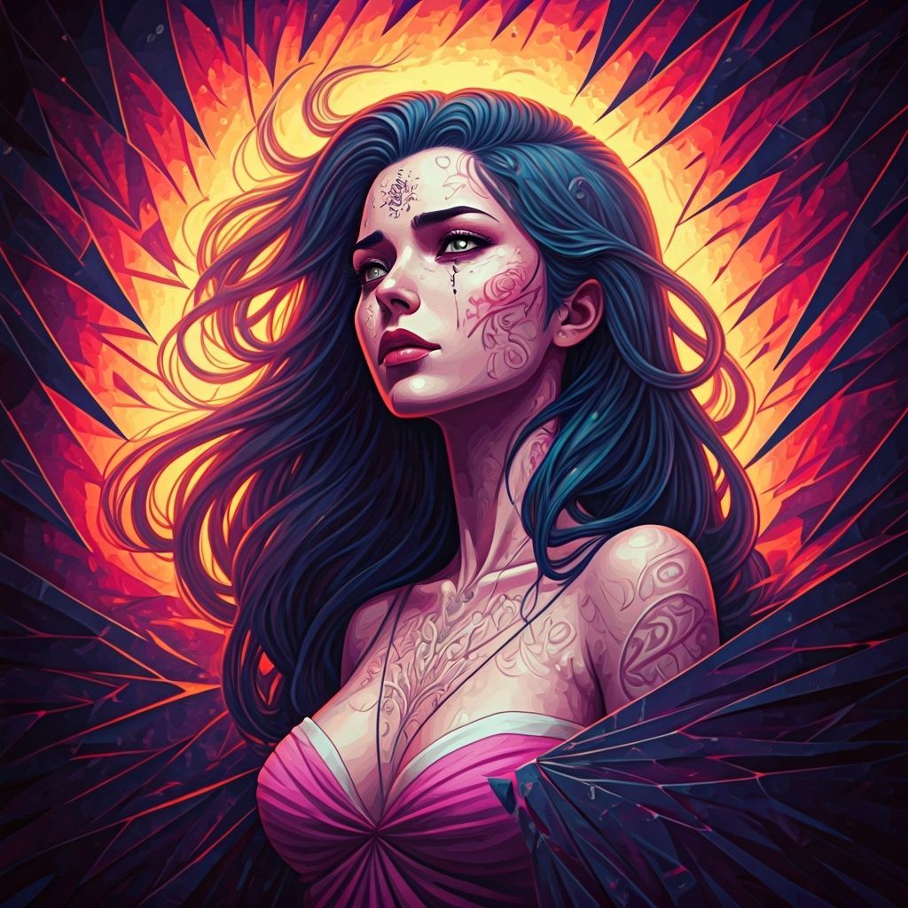 This image shows a beautiful woman in an 80s anime style, adorned with zentangle patterns and surrounded by eldritch magic. Dynamic lighting creates dramatic shadows in this comic book art style.