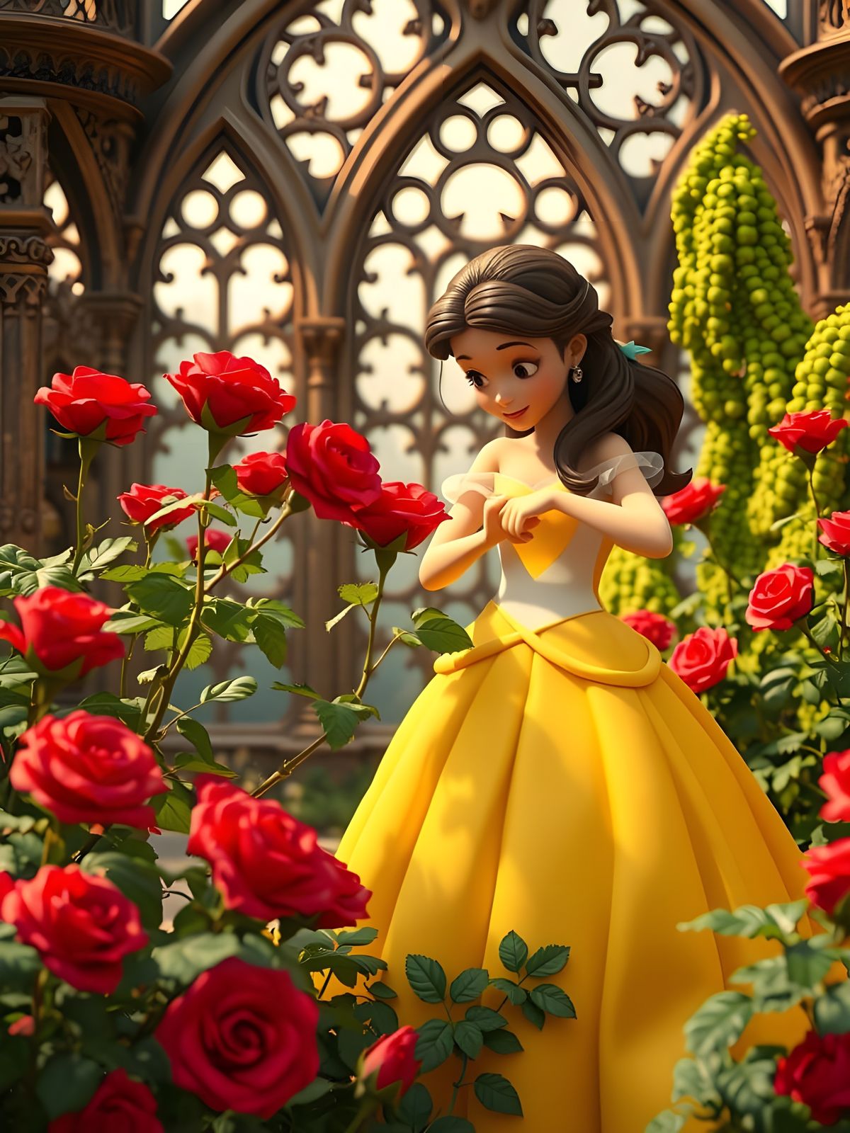 A 3D diorama of Belle from Beauty and the Beast tending roses in a greenhouse. The image is reminiscent of Pixar animation with warm lighting and intricate textures.