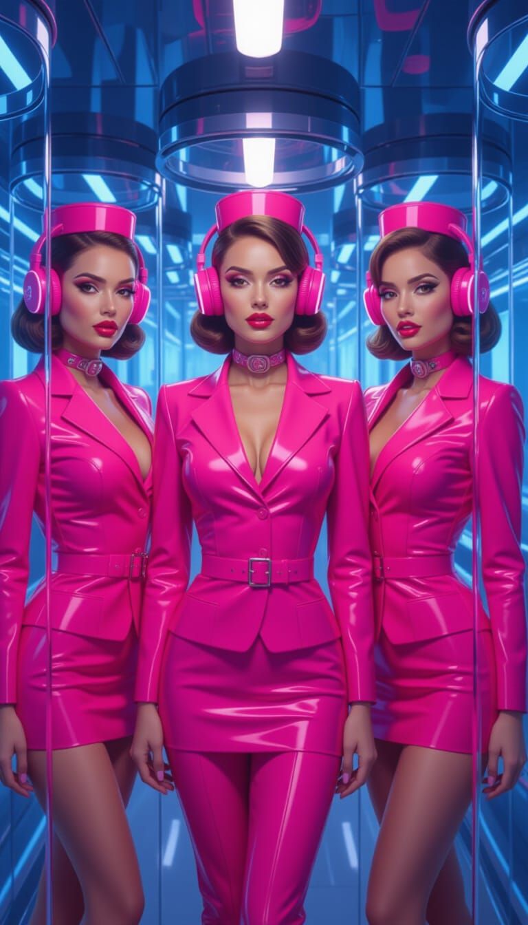 This image shows three women in pink air hostess uniforms inside glass cylinders. The scene is reminiscent of futuristic concept art with sleek neon lighting and vibrant, hyper-stylized details.