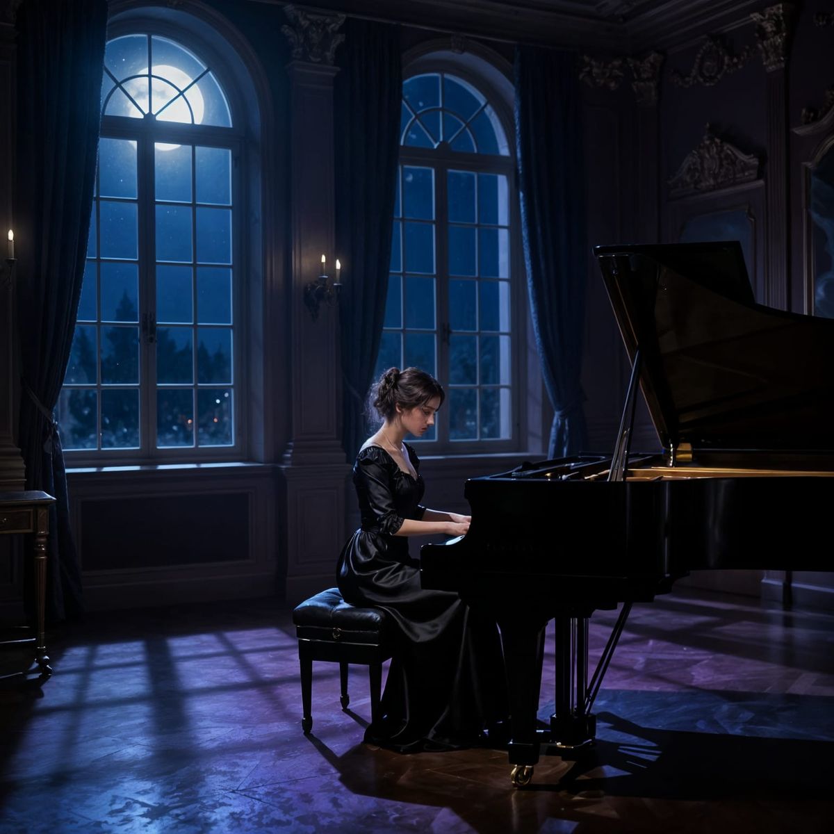 This image depicts a dimly lit, opulent salon at midnight in an early 19th-century Romantic style. Moonlight illuminates a solitary woman at a grand piano, lost in thought. The scene features deep blues and purples with silver highlights.