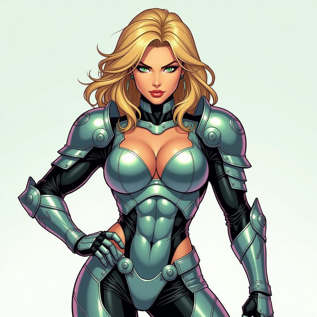 This image shows a heroic warrior woman with a muscular build and blonde hair, clad in metallic armor. The vibrant anime-style illustration features bold lines and dynamic shading.