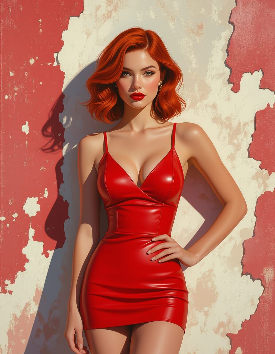 A striking image of a young woman with short red hair in a tight red leather dress, posing against a textured red wall. The hyper-realistic rendering features dynamic lighting.