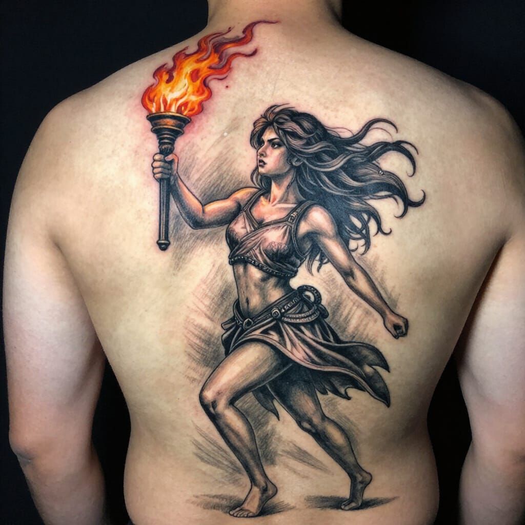 This image showcases a hyperdetailed charcoal drawing of a striking tattoo on a man's back. It features a girl in a dynamic pose holding a lit torch, symbolizing strength and hope, rendered with bold linework and realistic shading.