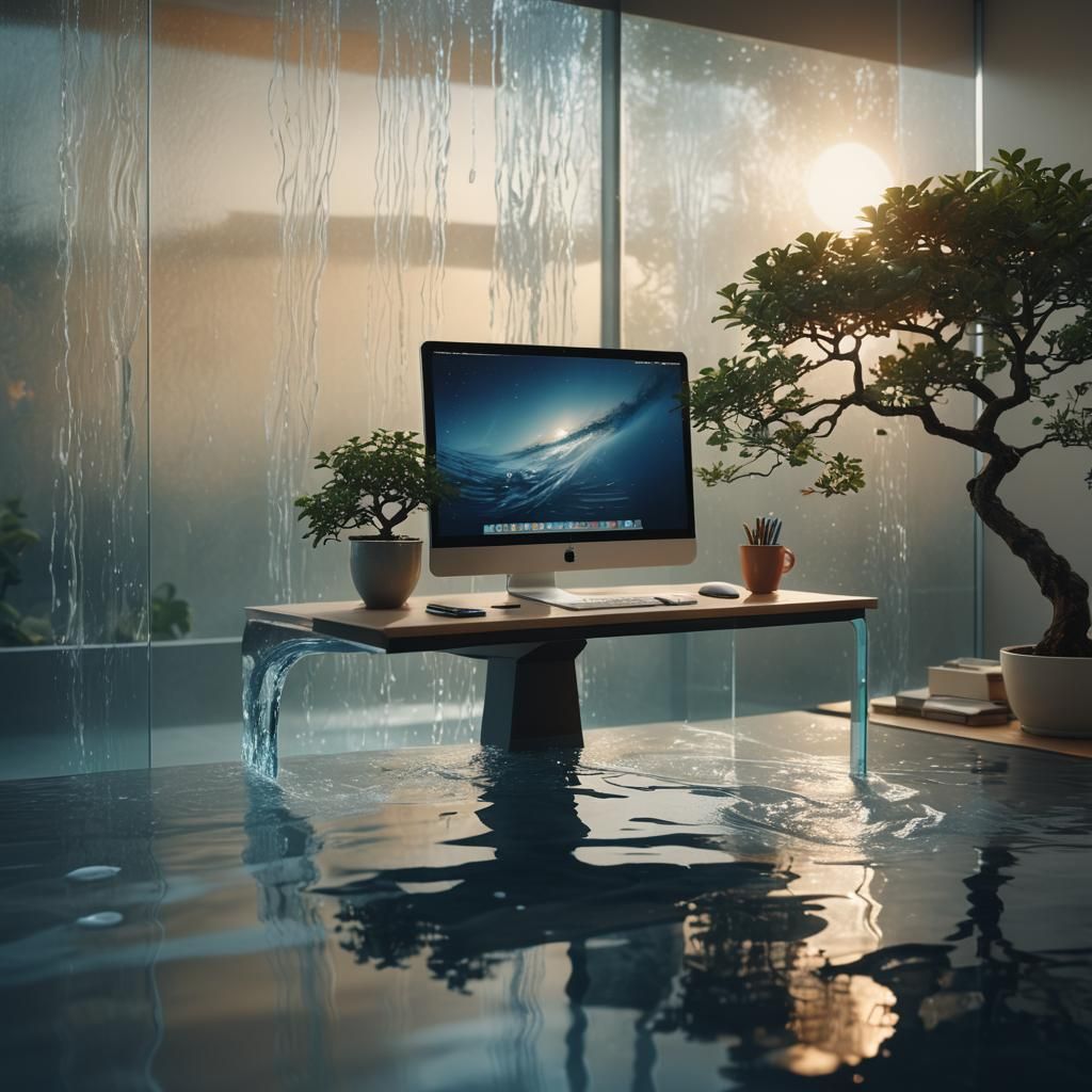 This image shows a minimalist office space with a desk, iMac, and bonsai tree. Water flows behind glass walls, illuminated by the iMac's soft glow. The room features deep blues and oranges in a fantastical, detailed digital art style.
