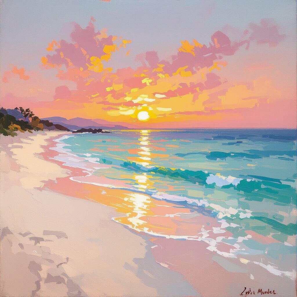 This image shows a serene beach at sunset, with the sky shifting from pink to orange above clear aquamarine waters and pale sand. Rendered in an impressionistic oil painting style.