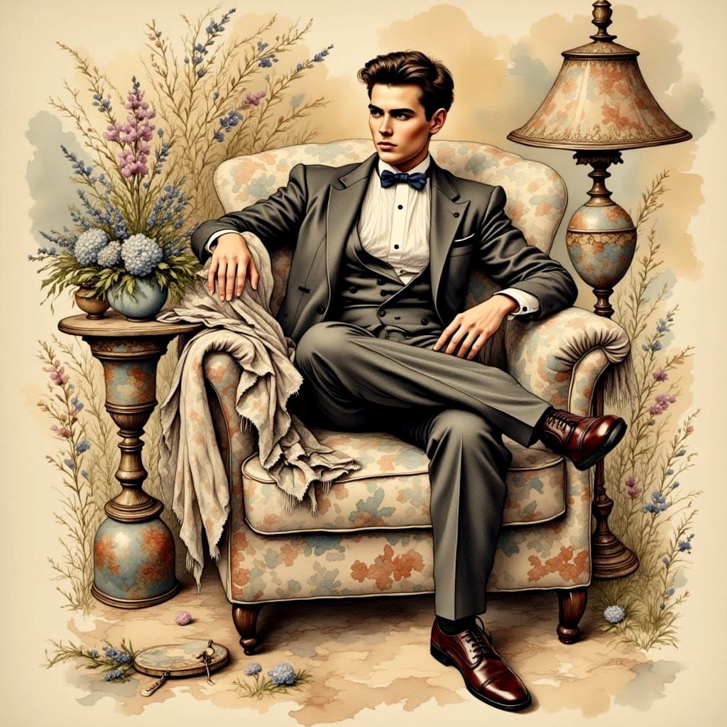 This image shows men's fashion from the 1950s, rendered in an antique watercolor style. The image evokes a sense of nostalgia and classic mid-century style.