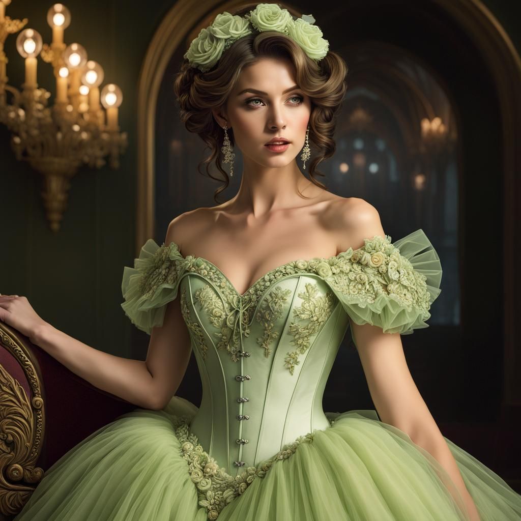 This image shows a woman wearing a formal avocado green tulle dress. The portrait features floral lace appliques, a corset bodice, and dynamic lighting in a detailed gouache painting.