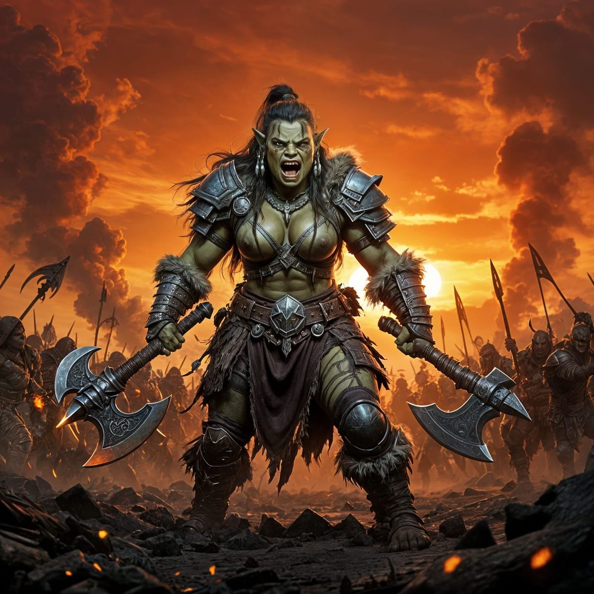 This image shows a powerful female Orc warrior, scarred and determined, leading a vast horde of Orcs. She wields a double-bladed axe, clad in barbaric armor under a rising sun.