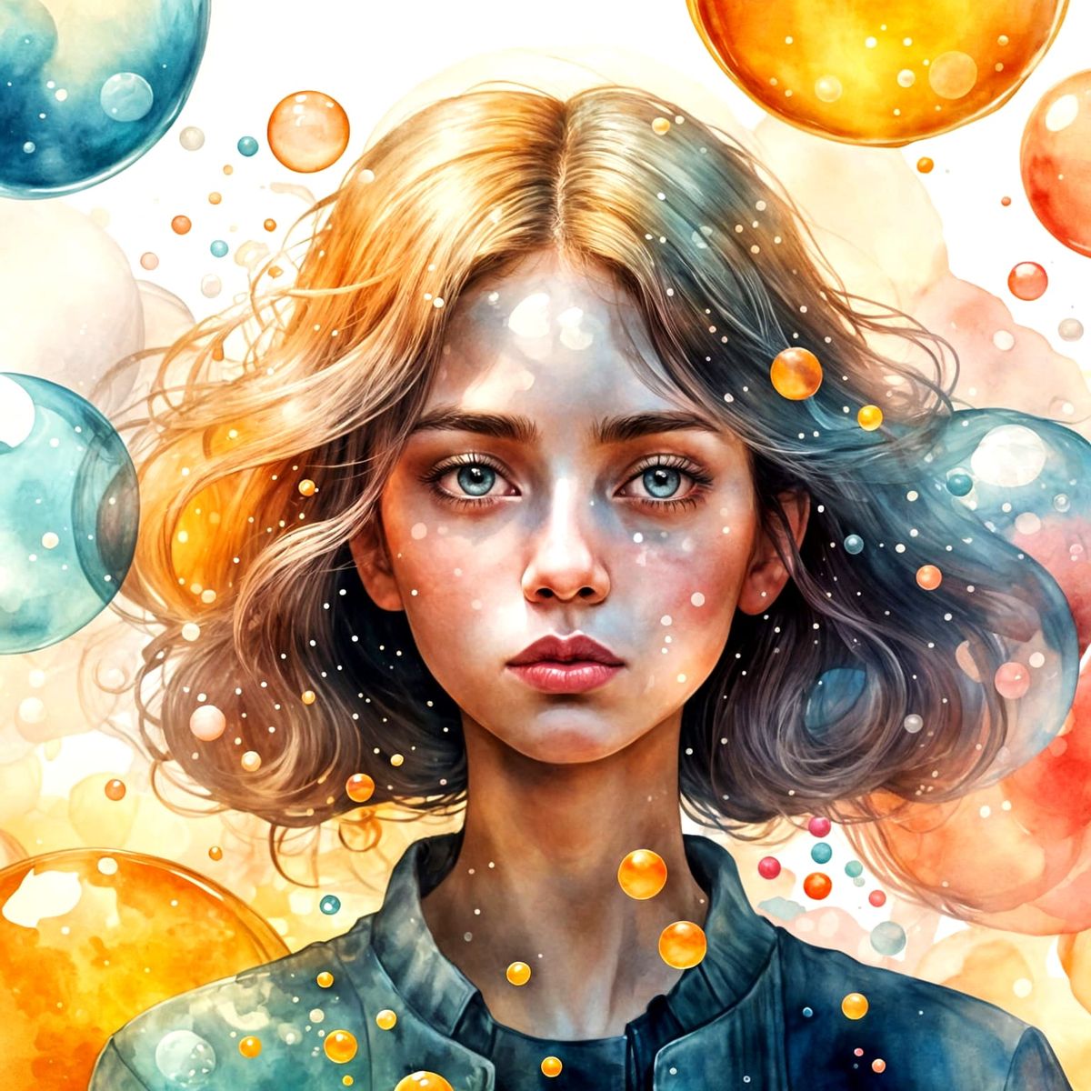 A watercolor-style ink drawing of a young girl surrounded by giant colorful bubbles. The monochrome background and vintage sepia tones evoke a surreal, early 20th-century photograph.