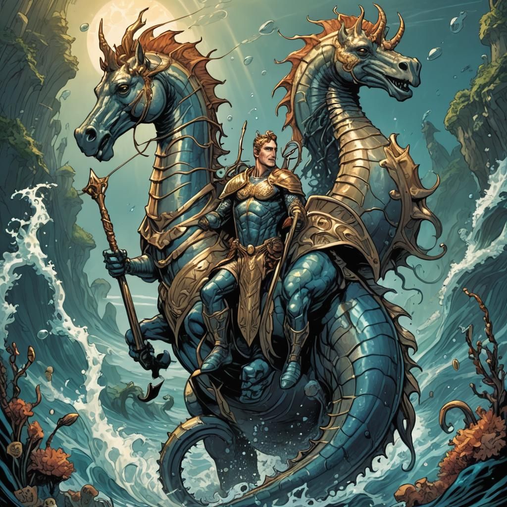 This image depicts Poseidon riding a seahorse underwater. The artwork shows comic book style elements with smooth lines and perfect details.