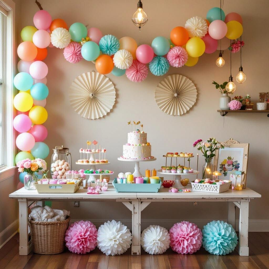 A charming baby shower scene with pastel decorations. The image features a cake table adorned with balloons, paper decorations, and fairy lights, all styled in a bohemian aesthetic.