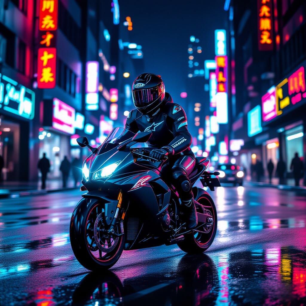This image shows a motorcyclist riding through a neon-lit cityscape at night. The scene is vibrant and futuristic, with reflections of colorful signs enhancing a cinematic atmosphere.