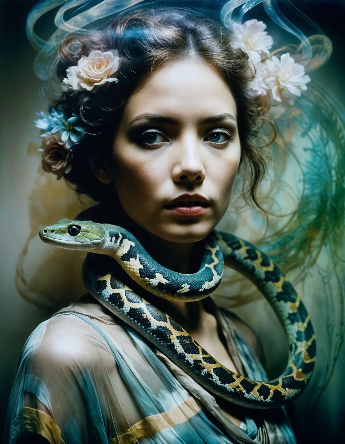 This image shows a vintage pinhole photograph of a woman with a snake. Soft colors and shadowplay create a surreal, dreamy effect, enhanced by patterned light and double exposure.