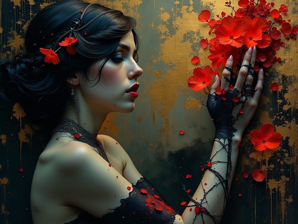 This image features a figure with perfect anatomy, rendered in an Art Deco style with surrealist influences. It incorporates glowing mesh chains and ghillie textures in cool gold and blue-grey tones, with dramatic lighting and expressive brushstrokes.