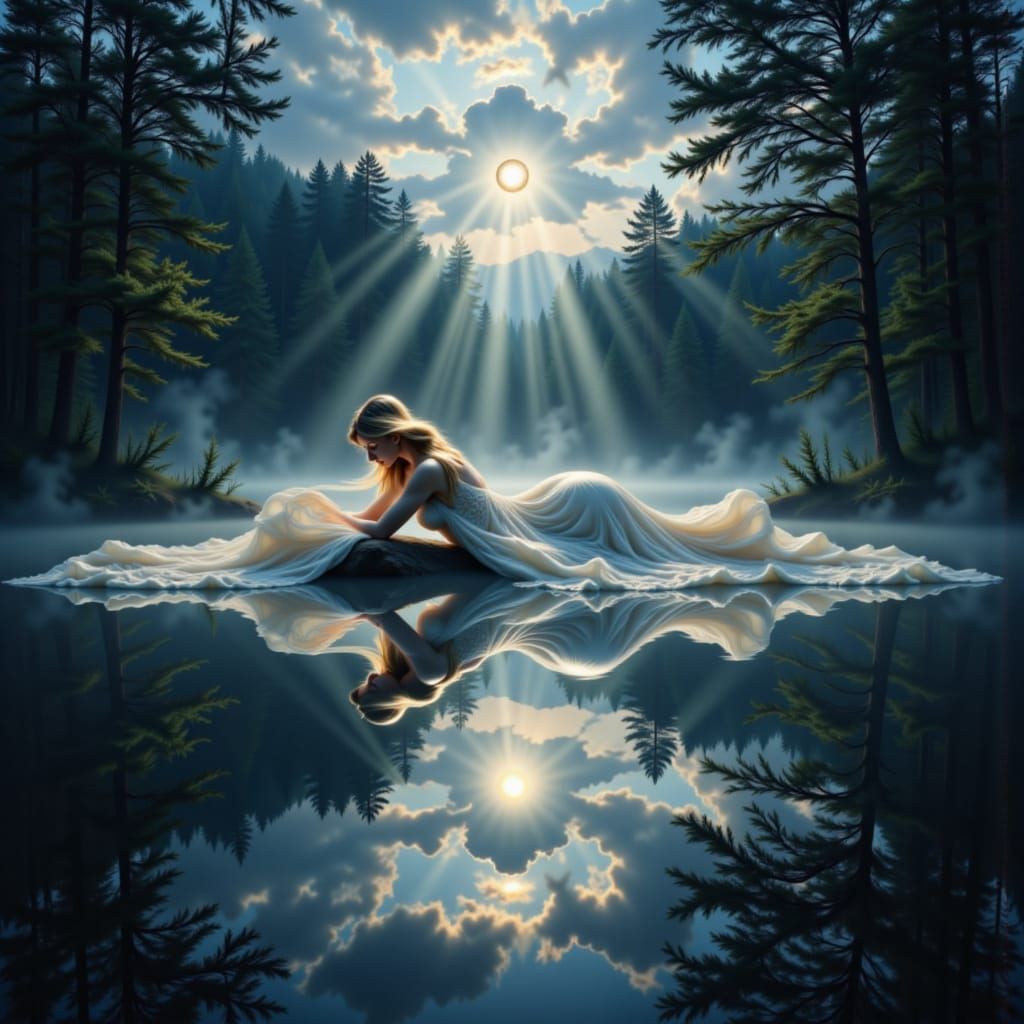 This image showcases a surreal double exposure featuring a sleeping goddess on a mirror lake under a full moon, illuminated by silver and gold light beams, inspired by Varo and Dali.