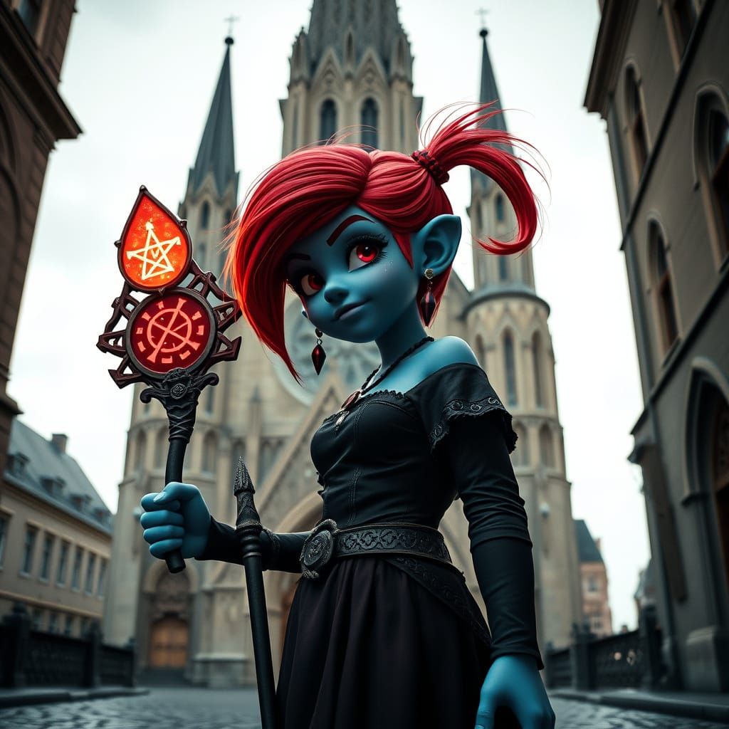 This image shows a teenage Smurfette rebel with red hair and gothic attire standing before a cathedral. She holds a glowing staff in a gritty dark fantasy aesthetic with cinematic lighting.
